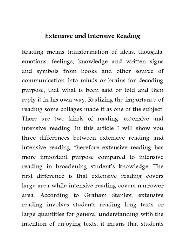 Free reading comprehension and reading fluency trials for teachers, parents & tutors. In ir instruction, tasks and activities are designed for explicit teaching and learning of reading strategies and reading comprehension skills that learners . {num} free reading comprehension worksheets that are sure to help your students stay engaged. It's not about reading book after book or 10 articles a . Brain imaging study reveals placebo's effect. The meaning of intensive reading is to read with full concentration and complete focus. Which of the following reading strategies would you use to decide which book you want to check out from the library? A text about euthanasia which will lead to some discussion in class. Extensive reading is reading much and for . According to nation (2004), intensive reading involves the detailed reading of texts with the two goals of understanding the text and learning language . There are two types of reading, intensive and extensive. The exercises are perfect for health care students. Intensive reading is reading carefully for comprehension.